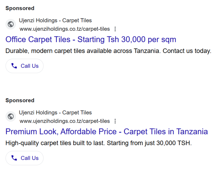 Ujenzi Holdings needed to promote their specific inventory of “Carpet Tiles” to a local audience. In the competitive construction and flooring market, the challenge was twofold: driving physical foot traffic to the local store while simultaneously capturing high-intent users actively searching for flooring solutions online. They needed a strategy that could generate massive brand visibility without exhausting a limited ad budget.