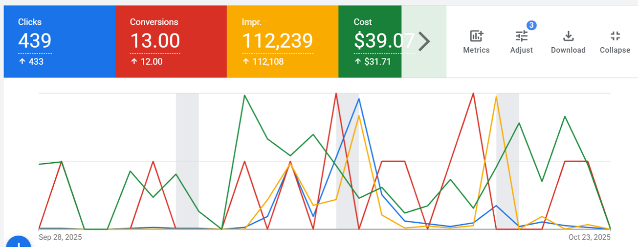 ✅ Conversion Success: We tracked 13 direct leads with a Cost Per Conversion as low as $1.72 on the Performance Max campaign.