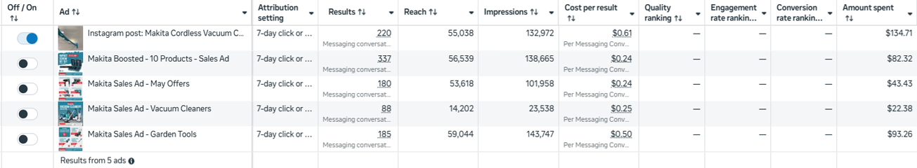 👥 Massive Lead Volume: In the snapshot provided, just 5 ads generated 1,010 direct messaging conversations from potential buyers.