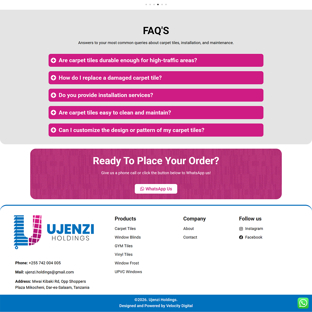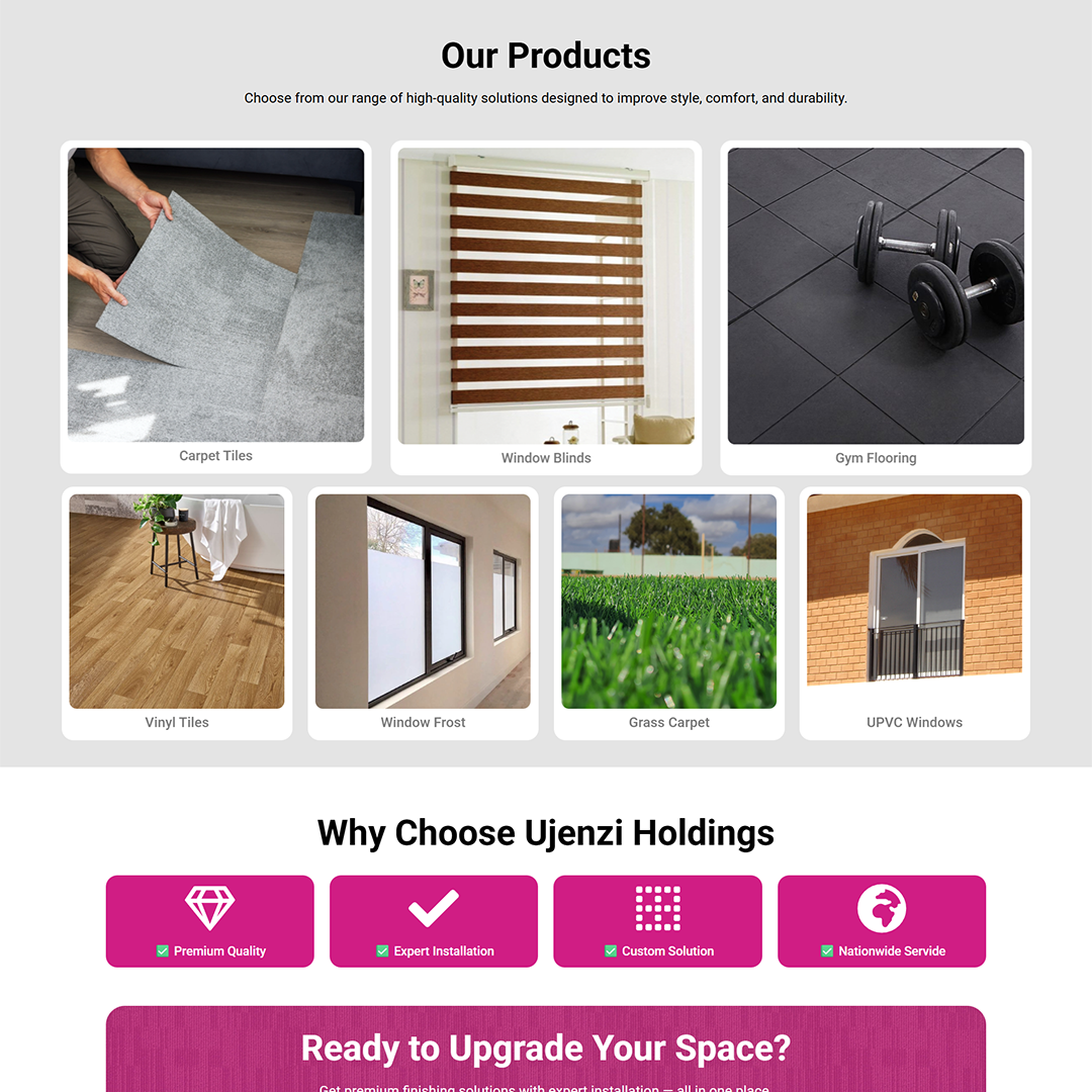 In the competitive home improvement sector, customers don’t just buy products; they buy the “finished look.” For Ujenzi Holdings, a standard e-commerce grid wasn’t enough. We needed to build a digital showroom that bridges the gap between raw materials and the final installed masterpiece. By focusing on visual inspiration, clear navigation, and direct-to-WhatsApp conversion paths, we created a website that turns casual browsers into booked installation clients.